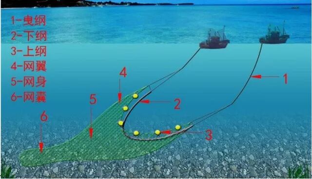 作业方式:双船对拖是用两艘渔船分开相当的距离合拖一挂鱼网进行捕鱼,其拖网长度可能在400-500米,网具入水较深。在航行拖网中,夜间可能只有一个驾驶员在值班航行,其他船员一般都在休息。在收网和放网时,夜间开启甲板照明灯,船员群集在甲板上忙碌工作。