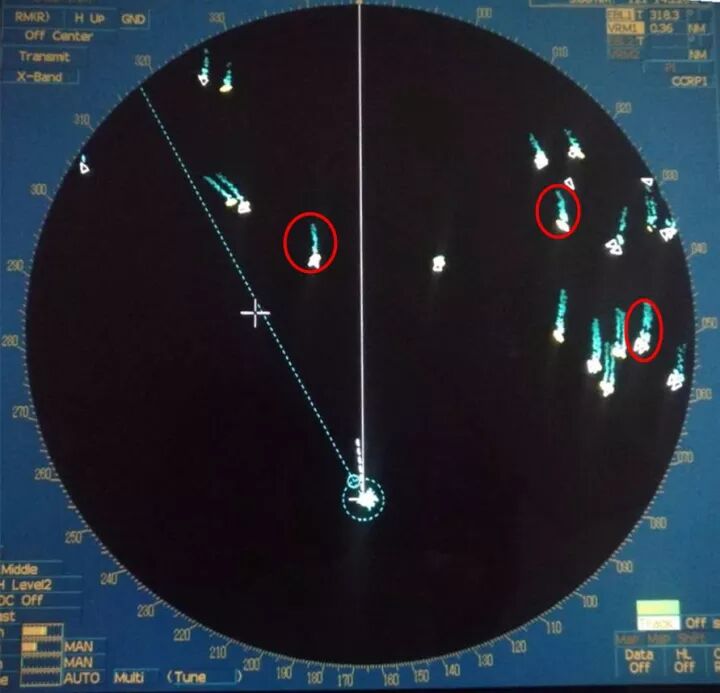 判别方法:正常气象条件下拖网航速约3-4节。一般对此类对拖渔船的分辨,在较平静的海面可以通过渔船尾部的航迹识别。在较近距离时可以看渔船尾部拖拽渔网纲缆延伸方向判断。也可利用雷达进行观察参考(如下图雷达回波红圈中为典型的双船对拖作业)。
